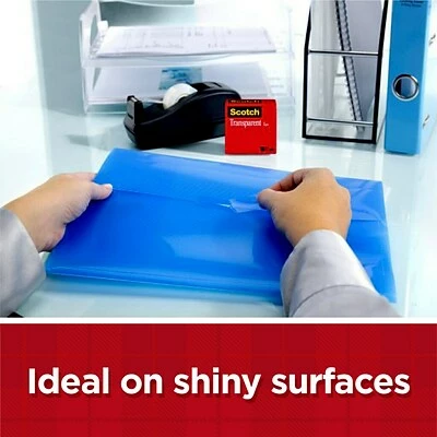 Featuring an adhesive backing, this Scotch transparent tape affixes securely to paper, cardboard and other everyday materials, allowing for convenient repair to damaged items. This tape pulls off of each roll effortlessly, staying firmly in place once it is applied to your desired items.
