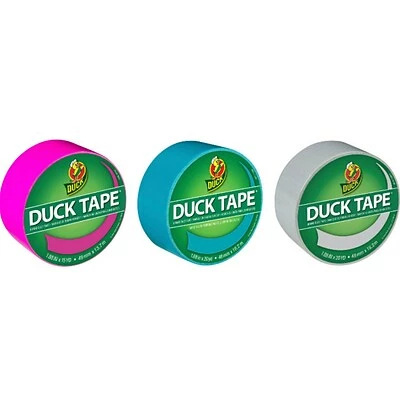 Almost everyone has a Duck tape story to tell, usually involving praise for its remarkable strength and versatility. Because of its strength and adhesive properties, you can use colored Duck tapes for almost any job, including everyday household and auto repairs – anywhere a flexible and weatherproof bond is needed. Colored Duck tapes are great for coordinating materials, color-coding and identification, craft applications, and more. These heavy-duty tapes are cotton mesh reinforced, but still easy to tear. Duck tapes conform to both smooth and uneven surfaces and can be used on materials such as cloth, vinyl, leather, plastic, and even metal and laminates. Duck tapes are great for any repairs, anywhere.