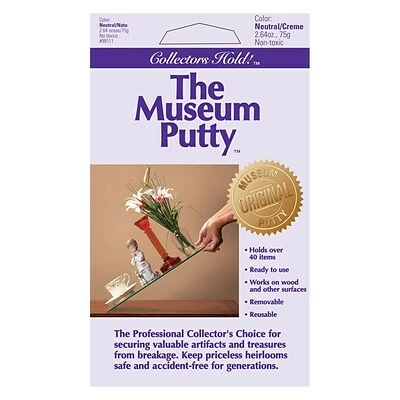 Ready America™ Collectors hold museum putty in white is easy to use by just rolling it in your fingers until soft and applying to the object’s base. Non-toxic putty causes no damage to furniture and is easily removable by just twisting and lifting.