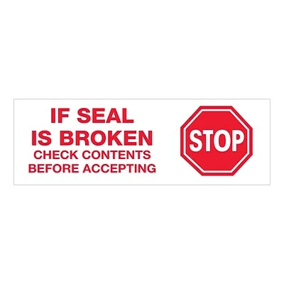 Tape Logic™ Pre printed “Stop If Seal Is Broken” carton sealing tape in red/white color measures 2″ x 55 yds and has strong adhesive. Pressure sensitive tape communicates handling instructions and seals at the same time, sold as 36 per case.