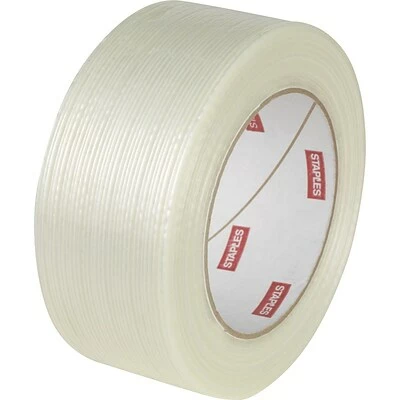 Seal boxes securely shut with this filament tape. With abrasion-resistant and water-resistant material, this filament tape can take on the most extreme conditions and ensures safe deliveries for packages, and it works great for boxes, containers, crates and other storage containers. This Staples fiberglass filament tape is made with a transparent material, letting you view shipping numbers and labels even after applying it.