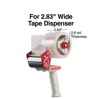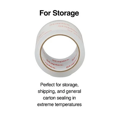 The Staples® lightweight moving and storage tape with dispenser is designed for easy one-handed operation to make box sealing quick and convenient.