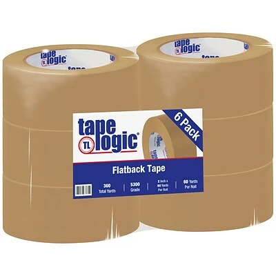 2″ x 60 yds. Kraft (6 Pack) Tape Logic® #5300 Flatback Tape. Aggressive adhesive yet light weight makes this tape ideal for carton sealing applications providing cost savings in shipping. Stronger than masking tape. Easy application – just tear and apply by hand. No water or dispensers needed. Write directly on tape. Seals securely under a wide range of temperature and humidity conditions. Brown paper tape.